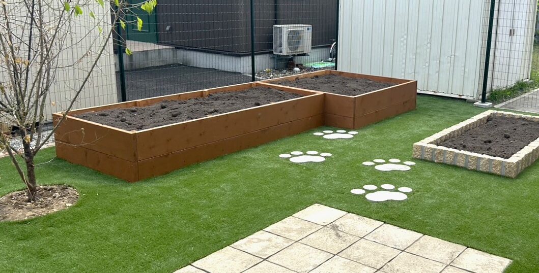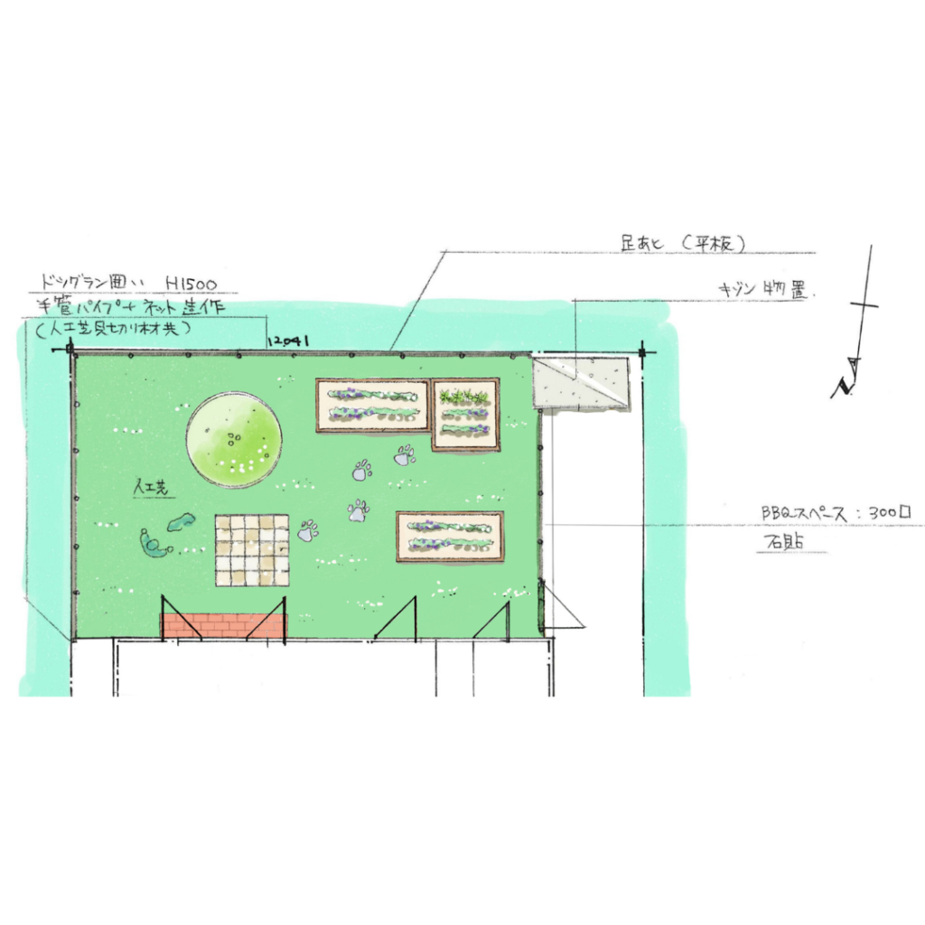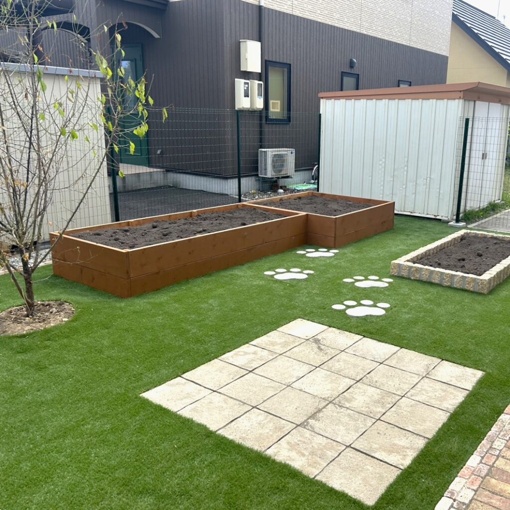 中には菜園とBBQスペース、花壇もありわんちゃんと一緒に過ごせるみんなが楽しいお庭になりました。